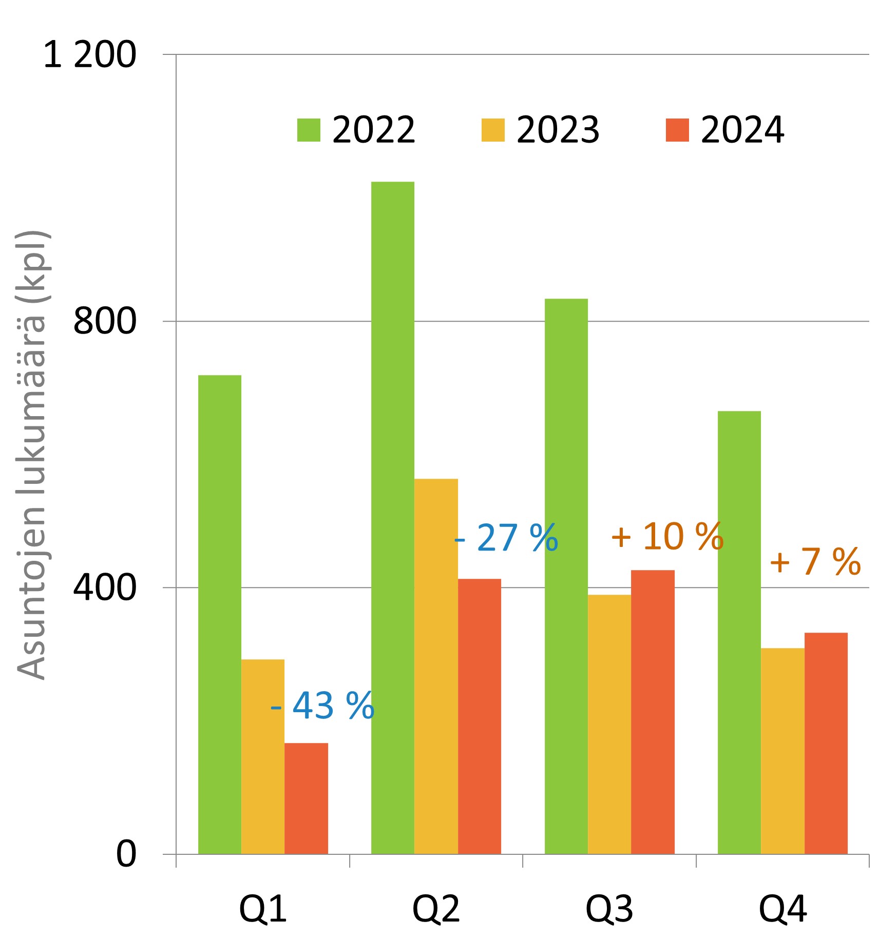 Talotoimitukset: Asiakkaille toimitettiin vuoden viimeisen neljänneksen aikana 332 omakoti- ja paritaloasuntoa (+7 %). Koko vuoden aikana talotoimituksia kertyi 1 338 (-14 %).
